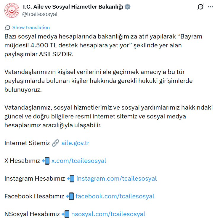 "Bazı sosyal medya hesaplarında bakanlığımıza atıf yapılarak "Bayram müjdesi! 4.500 TL destek hesaplara yatıyor" şeklinde yer alan paylaşımlar ASILSIZDIR.
