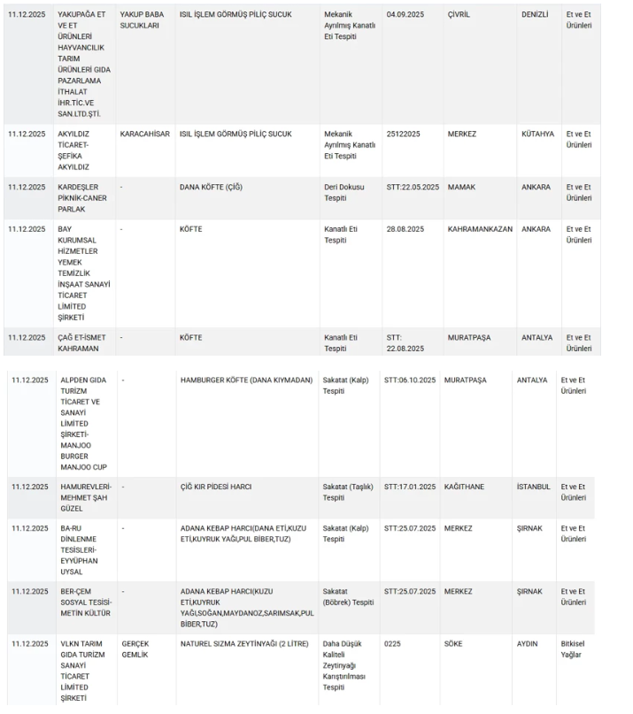 Bir köfte harcında deri dokusu ve başka bir köfte ürününde mekanik ayrılmış kanatlı et tespit edildiği bildirildi. Ayrıca hamburger köftesinde kalp tespit edildiği de listeye yansıdı.