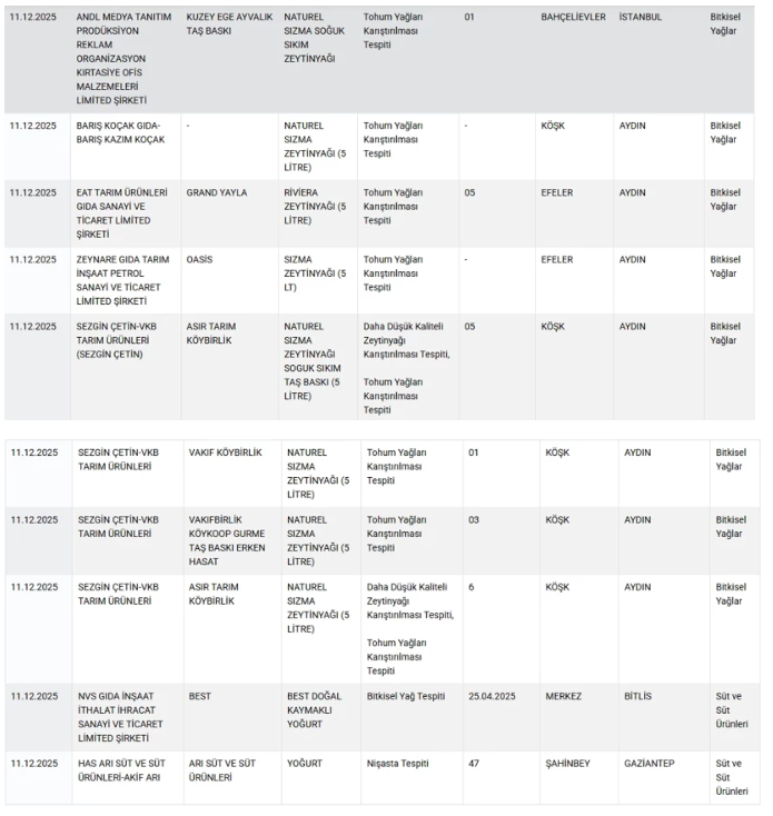 Zeytinyağı ve diğer yağ ürünleri, yoğurt, bal gibi temel gıdalarda hileye rastlandı. Bakanlık, bazı yoğurt ürünlerinde nişasta katıldığı, zeytinyağlarına daha düşük kaliteli tohum yağlarının karıştırıldığını duyurdu.