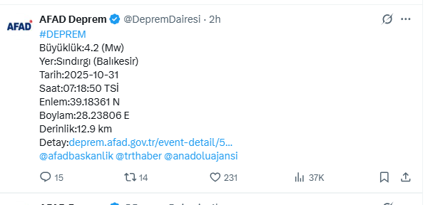 AFAD’ın sosyal medya hesabından paylaştığı bilgilere göre, Balıkesir’in Sındırgı ilçesinde saat 07.18’de 4.2 büyüklüğünde deprem meydana geldi. Depremin derinliği ise 12.9 kilometre olarak kaydedildi.