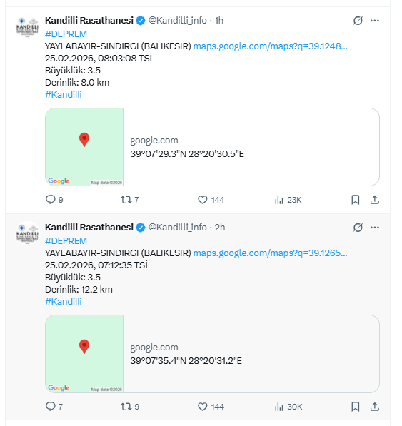 Kandilli Rasathanesi'nin sosyal medya hesabı üzerinden paylaşılan verilere göre ilk deprem saat 07.12'de 3.5 büyüklüğünde gerçekleşti. İkinci deprem ise 08.03'te 3.5 büyüklüğünde meydana geldi. Rasathane merkezi Sındırgı olan depremlerin derinliğini sırasıyla 12.2 kilometre, 8.0 kilometre olarak açıkladı.