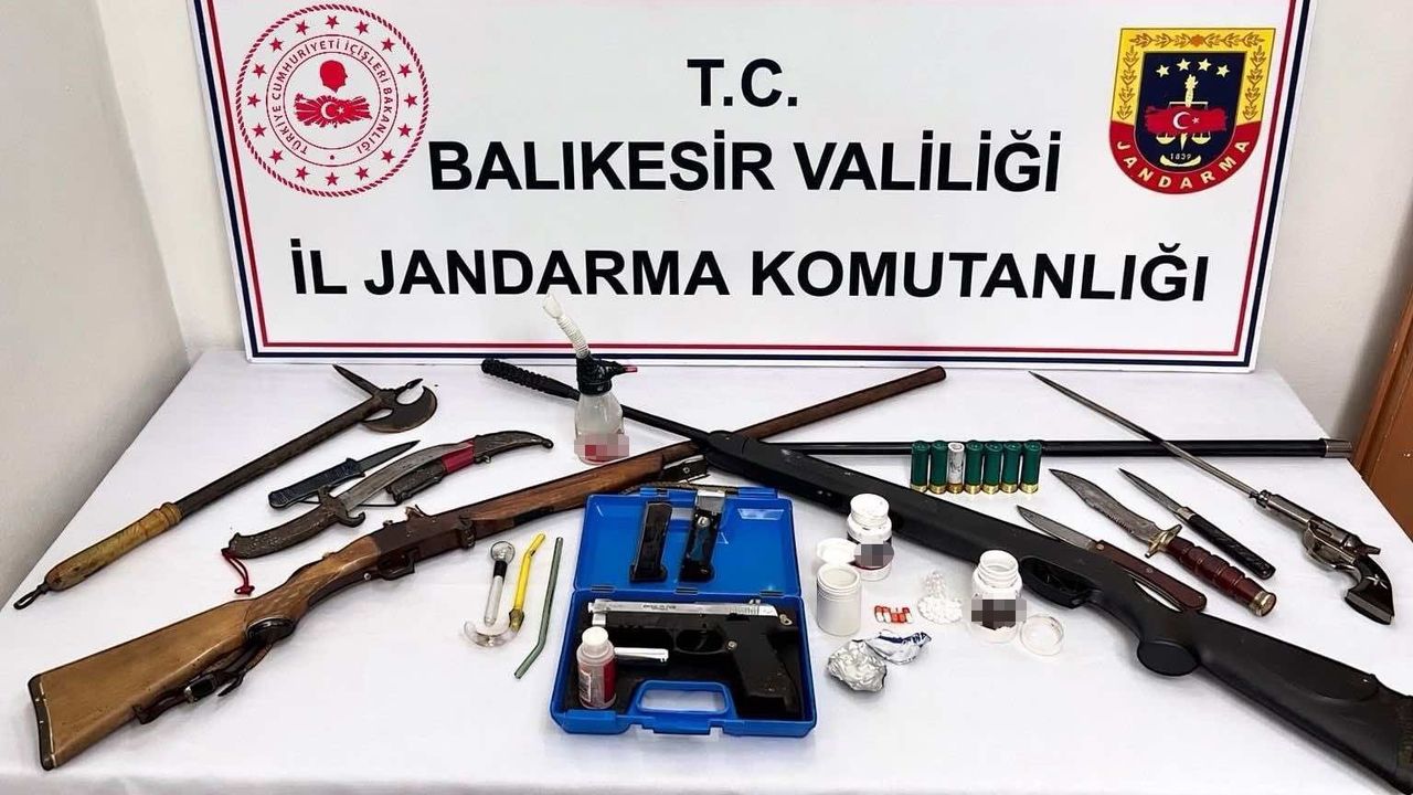 Operasyonda 1 kilo 845 gram bonzai, 562 gram metamfetamin, 31 gram esrar, 11 sentetik uyuşturucu hap, 1 hassas terazi, 8 ruhsatsız tabanca ve 9 ruhsatsız av tüfeği ele geçirildi.