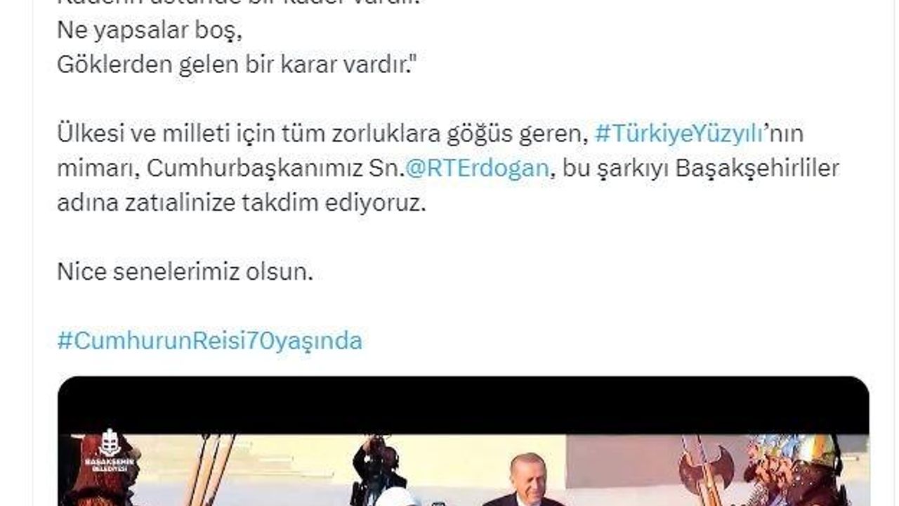 Başkan Kartoğlu, dillere pelesenk olacak o şarkıyı, “Yeni yaşındasın, bak geçti ömür milletine hizmet ederek. Bunca derde göğüs germeye bak. Sendeki gibi koca yürek gerek. Sakın kader deme, kaderin üstünde bir kader vardır. Ne yapsalar boş, göklerden gelen bir karar vardır. Ülkesi ve millet için tüm zorluklara göğüs geren Türkiye Yüzyılı’nın mimarı Cumhurbaşkanımız Sayın Recep Tayyip Erdoğan, bu şarkı Başakşehirliler adına zatıalinize takdim ediyoruz. Nice senelerimiz olsun” mesajıyla sosyal medya hesaplarından paylaştı. Sözleri çok beğenilen şarkı, sosyal medya platformlarında kısa sürede geniş kitlelere ulaştı.