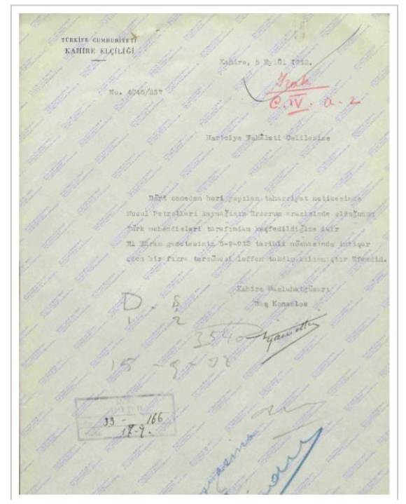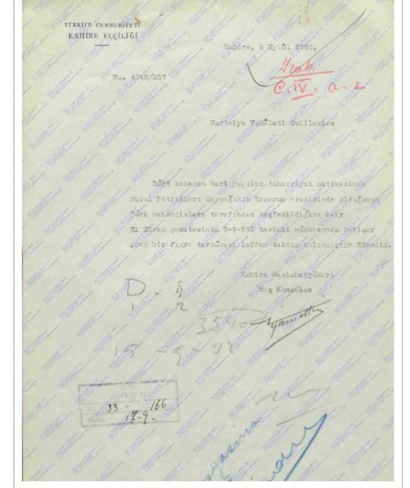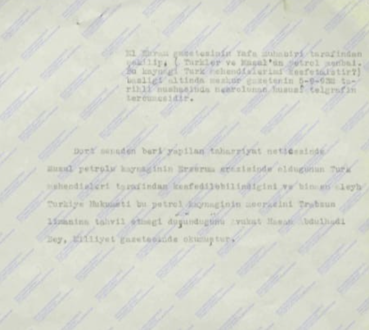 Söz konusu belge, Musul petrollerinin kaynağıyla ilgili uzun süredir tartışılan soruya ışık tutuyor ve Erzurum’un tarihî stratejik önemini yeniden gözler önüne seriyor. Belgeye göre, Musul petrollerini besleyen ana damarlar Erzurum topraklarından başlıyor ve o dönemde Türk mühendisler tarafından tespit edilmişti. Bu bilgi, 5 Eylül 1932 tarihinde Mısır’ın köklü gazetesi AlAhram tarafından yayımlandı. Gazetenin Yafa muhabirinin haberinde şu ifadeler yer aldı: "Türkler ve Musul Petrol Menbaı - Bu Kaynağı Türk Mühendisler Keşfetmiştir."