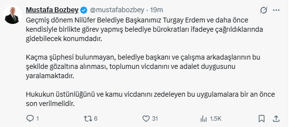 Operasyonda eski Nilüfer Belediye Başkanı Turgay Erdem’in gözaltına alınmasının ardından sosyal medya hesabı üzerinden açıklama yapan Bursa Büyükşehir Belediye Başkanı Mustafa Bozbey, “Geçmiş dönem Nilüfer Belediye Başkanımız Turgay Erdem ve daha önce kendisiyle birlikte görev yapmış belediye bürokratları ifadeye çağrıldıklarında gidebilecek konumdadır. Kaçma şüphesi bulunmayan, belediye başkanı ve çalışma arkadaşlarının bu şekilde gözaltına alınması, toplumun vicdanını ve adalet duygusunu yaralamaktadır. Hukukun üstünlüğünü ve kamu vicdanını zedeleyen bu uygulamalara bir an önce son verilmelidir." ifadelerini kullandı.