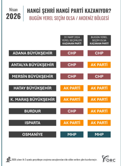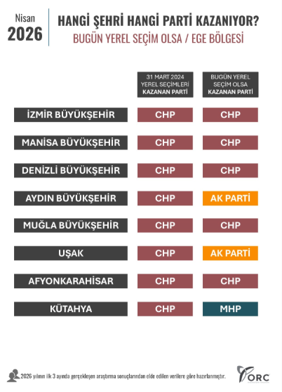 ORC Araştırma tarafından 2026 yılının ilk üç ayında elde edilen verilerle hazırlanan anket sonuçları kamuoyuyla paylaşıldı. “Bugün yerel seçim olsa” başlığıyla yayımlanan çalışmada, Ege ve Akdeniz bölgelerindeki büyükşehir ve il belediyelerine ilişkin dikkat çekici sonuçlar yer aldı.