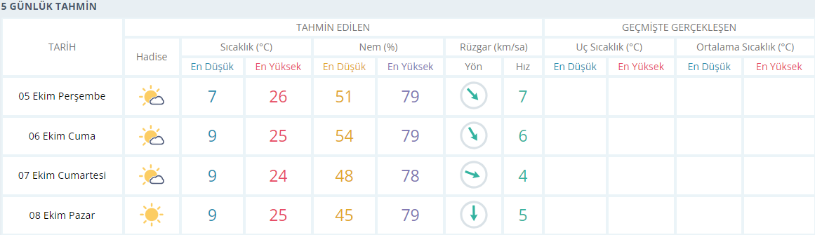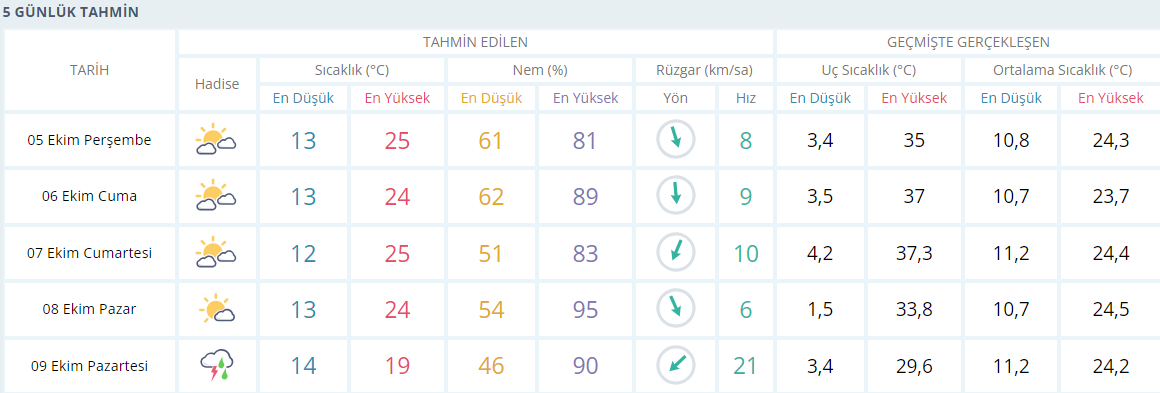 Haftanın son iş gününde (Yarın) sabah saatlerinde 13 derece olarak ölçülürken gün içerisinde parçalı bulutlu ve güneşli bir gökyüzü hakim olacak ve en yüksek sıcaklık ise 24 derece olarak bekleniyor.