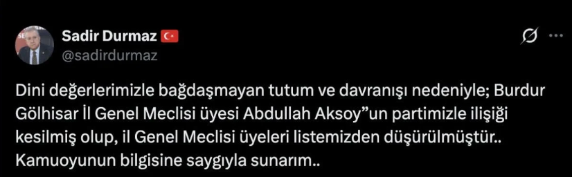Öte yandan MHP Genel Başkan Yardımcısı Sadir Durmaz, o ortamda bulunan Burdur Gölhisar İl Genel Meclisi üyesi Abdullah Aksoy'un partiyle ilişiğinin kesildiğini duyurdu.