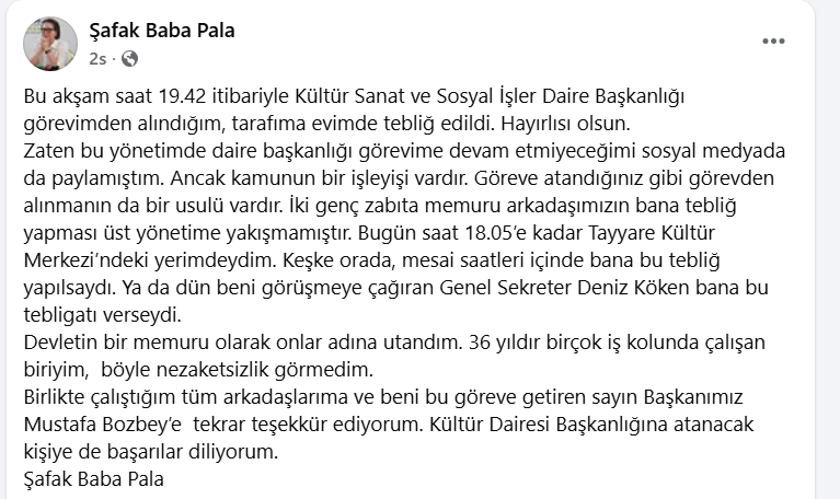 Bu akşam saat 19.42 itibariyle Kültür Sanat ve Sosyal İşler Daire Başkanlığı görevimden alındığım tarafıma, evimde tebliğ edildi. Hayırlısı olsun. Zaten bu yönetimde daire başkanlığı görevime devam etmeyeceğimi sosyal medyada da paylamıştım. Ancak kamunun bir işleyişi vardır.