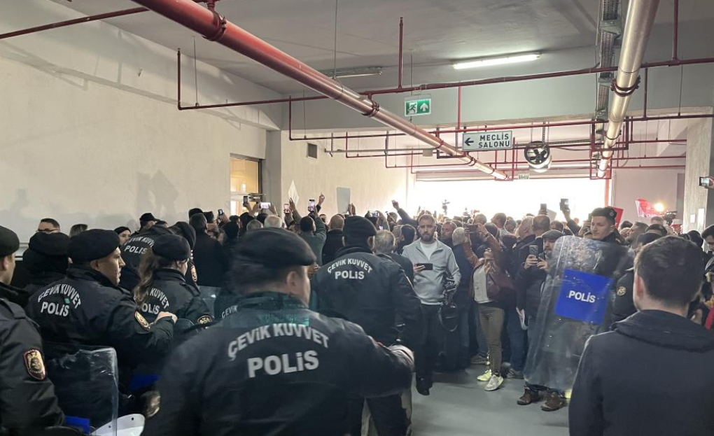 Polis tedbirini sürdürürken, belediye binasındaki gerginlik de devam ediyor.