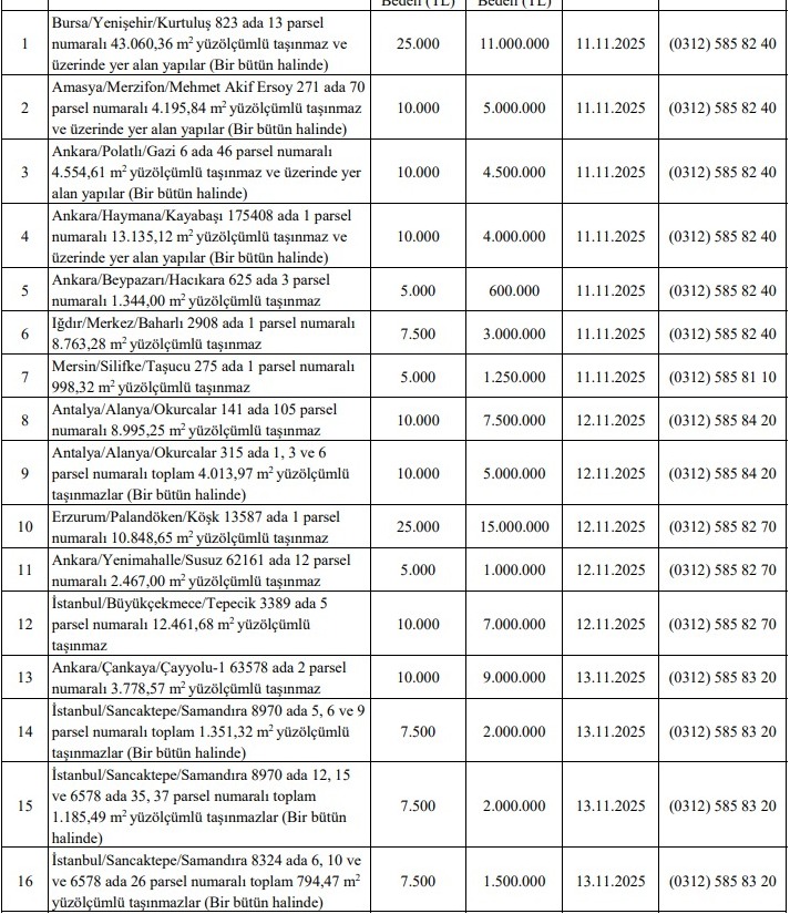 Özelleştirme kapsamına alınan taşınmazlar arasında Bursa da yer alıyor. Bunun yanı sıra Amasya, Ankara, Iğdır, Mersin, Antalya, Erzurum ve İstanbul illerindeki çeşitli taşınmazların da satışa çıkarılacağı bildirildi. Bu taşınmazlar için son teklifler, 11, 12 ve 13 Kasım'a kadar verilebilecek. İhaleler, önce kapalı zarf usulüyle teklif toplanarak başlayacak; ardından uygun görülen katılımcılarla pazarlık görüşmeleri yapılacak. Sürecin son aşamasında ise açık artırmaya geçilerek satışlar sonuçlandırılacak.