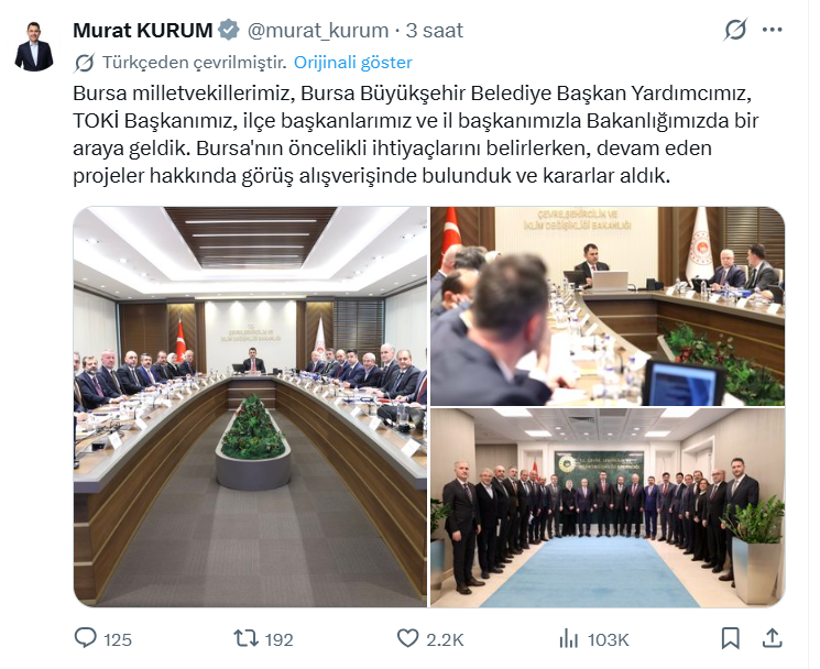"Bursa milletvekillerimiz, Bursa Büyükşehir Belediye Başkan Vekilimiz, TOKİ Başkanımız, ilçe belediye başkanlarımız ve il başkanımız ile Bakanlığımızda bir araya geldik.
