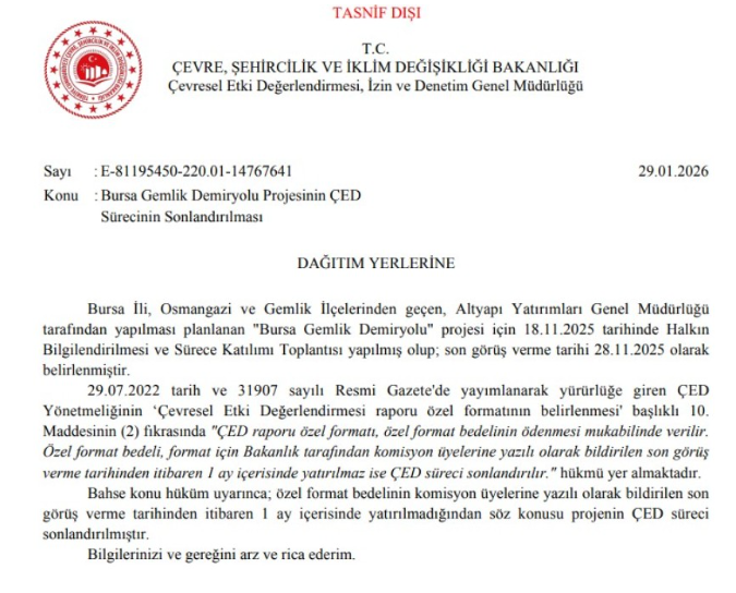 2 milyar 865 milyon TL maliyetle Osmangazi ve Gemlik ilçeleri arasından geçmesi planlanan proje için 18 Kasım 2025'te Halkın Katılımı Toplantısı yapılmıştı. Ancak ÇED Yönetmeliği'nin 10. maddesi uyarınca yatırılması gereken "özel format bedeli", yasal süresi içinde ödenmedi. Çevre, Şehircilik ve İklim Değişikliği Bakanlığı'ndan yapılan açıklamada, son görüş verme tarihi olan 28 Kasım 2025'ten itibaren 1 ay içinde ödenmesi gereken bedelin yatırılmadığı, bu nedenle projenin ÇED sürecinin yönetmelik gereği resmen sonlandırıldığı belirtildi.