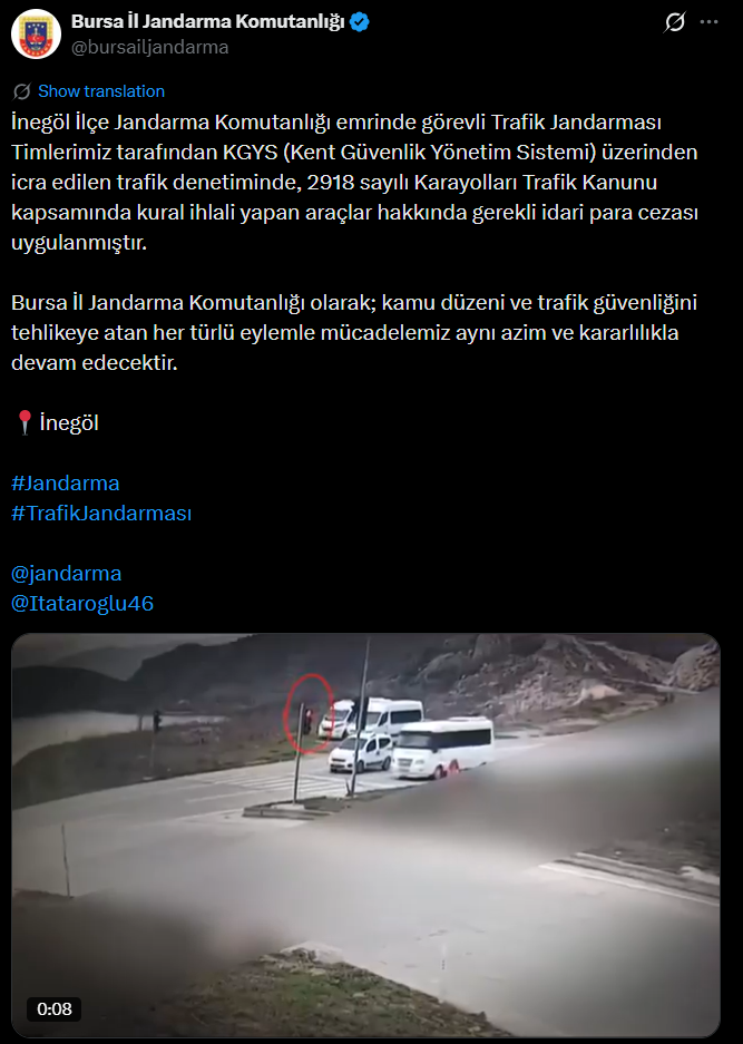 Yapılan denetimlerde, 2918 sayılı Karayolları Trafik Kanunu kapsamında İnegöl–Yenişehir yolu 2. Mobilya Sanayi Kavşağı’nda kural ihlali yaptığı tespit edilen araç sürücülerine idari para cezası uygulandı. Yapılan açıklamada "Bursa İl Jandarma Komutanlığı olarak; kamu düzeni ve trafik güvenliğini tehlikeye atan her türlü eylemle mücadelemiz aynı azim ve kararlılıkla devam edecektir." denildi.