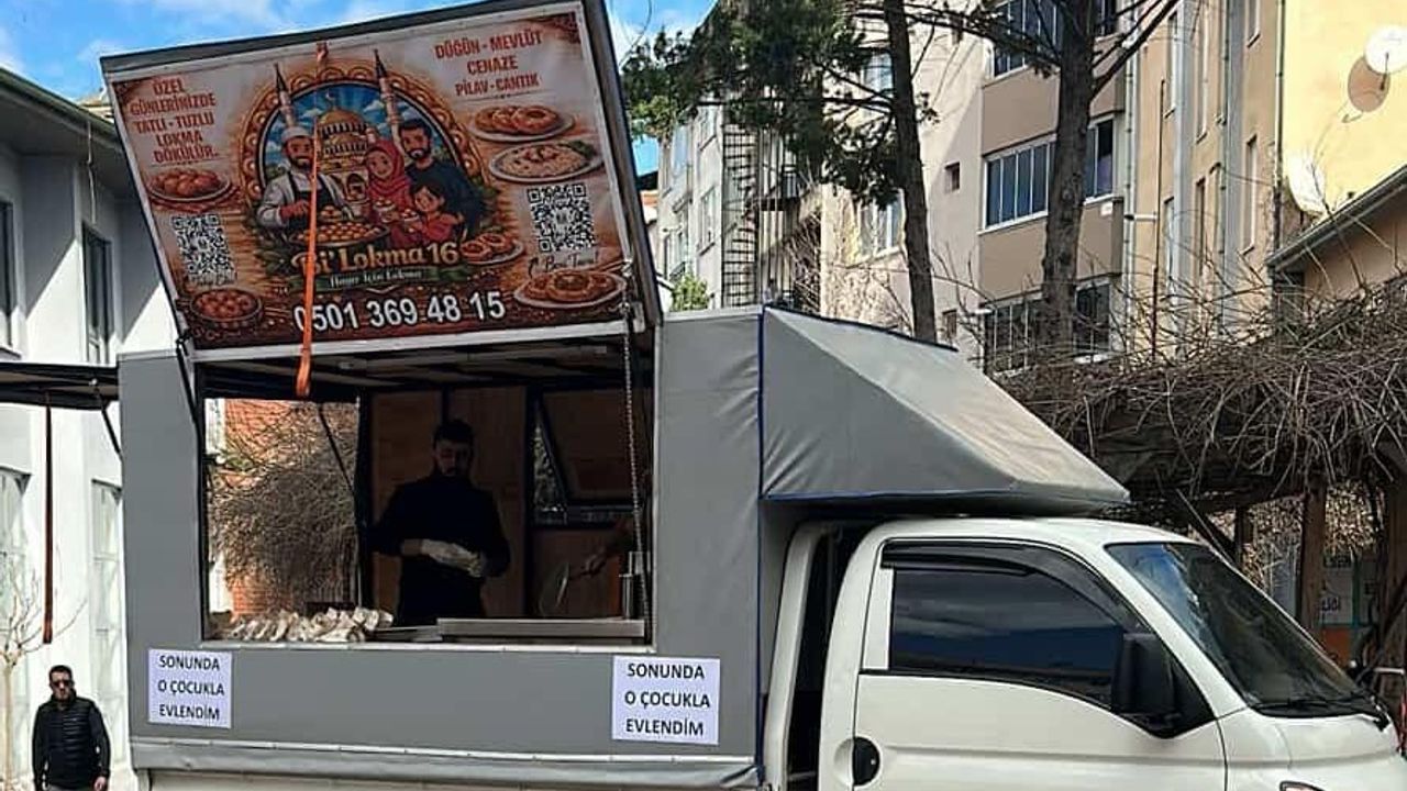 İnegöl Sani Konukoğlu Camii önünde kurulan lokma aracında vatandaşlara ikramda bulunulurken, lokma aracına asılan “Sonunda o çocukla evlendim” yazısı dikkat çekti. Lokma dağıtımı çevredeki vatandaşlar tarafından ilgiyle karşılandı.