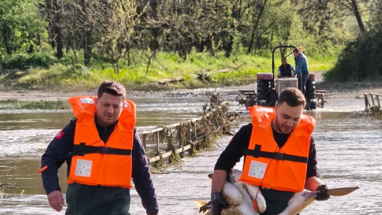 Kısa sürede bölgeye ulaşan ekipler, suya uygun özel kıyafetlerini ve can yeleklerini giyerek kurtarma çalışması başlattı. Zorlu şartlarda gerçekleştirilen çalışmada, çalılıklar arasında sıkıştığı belirlenen yaralı pelikan bulunduğu yerden dikkatli bir şekilde çıkarıldı.