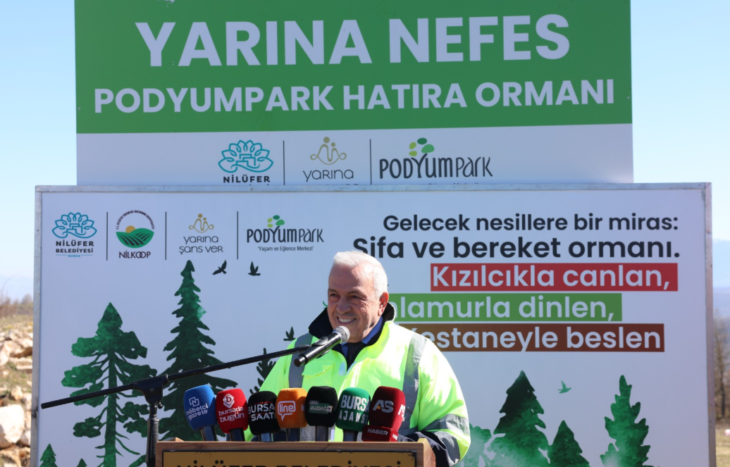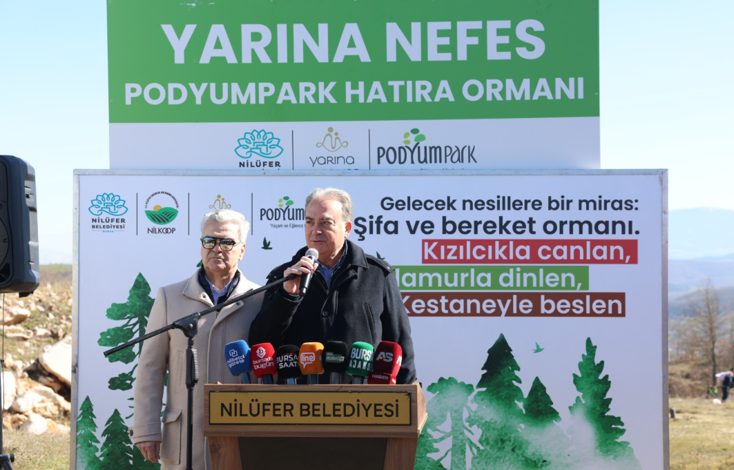 Nilüfer Belediye Başkanı Şadi Özdemir burada yaptığı konuşmada, toprağa, doğaya ve geleceğe sahip çıktıklarını söyledi. Özellikle kırsal bölgelerde yeniden sürdürülebilir bir yaşam için NİLKOOP ile birlikte çalışma yürüttüklerini dile getiren Başkan Şadi Özdemir, “Vatandaşlarımıza toprak analizleri, mühendis desteği, satın alma güvencesi gibi birçok destek veriyoruz ki bu toprakları koruyabilelim. Belki 100 yıl sonra da bu topraklardan üretilen ürünlerle çocuklarımız, torunlarımız karınlarını doyurabilsin istiyoruz” dedi. Belediyeye ait arazilerin boş durmaması için ekip biçtiklerini anlatan Başkan Şadi Özdemir, “Ancak bazı alanlarımız ekime uygun değil. Eğimi yüksek, işlemesi zor olan arazilerimiz vardı. Biz dedik ki; Nilüfer’de hiçbir toprak parçası boş kalmamalı. O arazileri yeniden üretime kazandırmalıyız. Güngören Mahallesi’ndeki 32 dekar alanımız da bunlardan birisi. Biz de sivil toplum ile güçlerimizi birleştirdik. Yarına Şans Ver Derneği ve Podyumpark desteğiyle ‘Yarına Nefes Podyumpark Hatıra Ormanı’nı hayata geçiriyoruz” dedi.