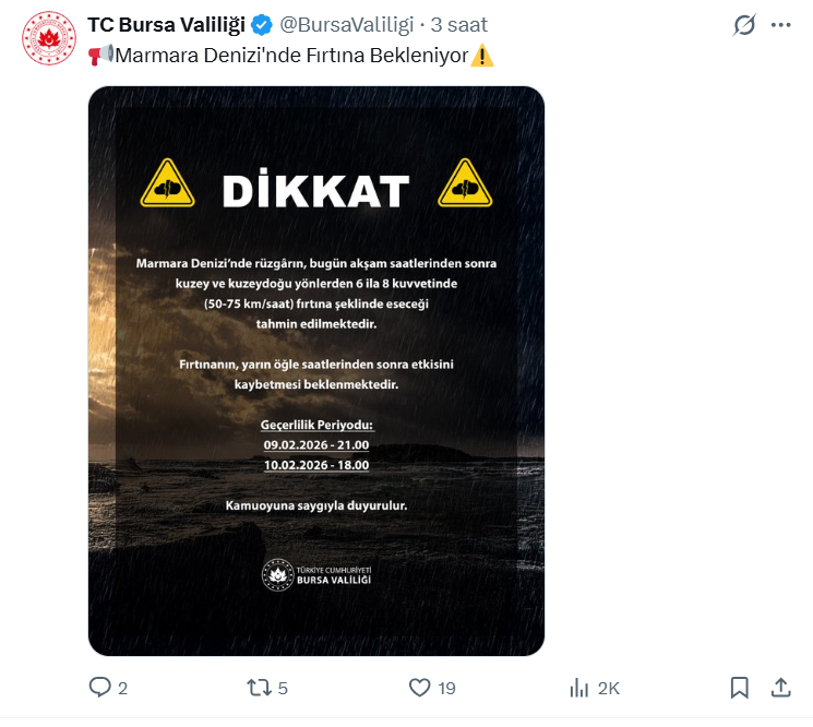 Bursa Valiliği tarafından yapılan açıklamada, 9 Şubat Pazartesi günü akşam saat 21.00'de başlaması beklenen fırtınanın yarın saat 18.00'e kadar etkisini sürdürmesinin beklendiği vurgulanarak, vatandaşlardan muhtemel olumsuzluklara karşı dikkatli ve tedbirli olmaları istendi.