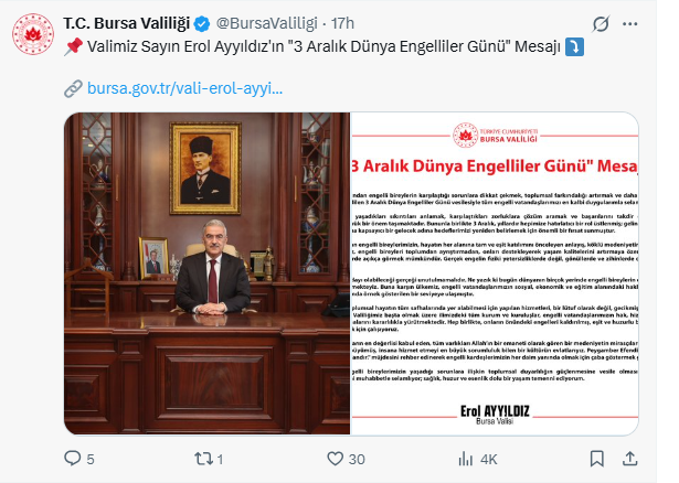 Dünyanın birçok yerinde engelli bireylerin hala dışlandığına dikkat çeken Vali Ayyıldız, Türkiye’nin engelli vatandaşların sosyal, ekonomik ve eğitim haklarına erişimi konusunda önemli ilerlemeler kaydettiğini dile getirdi. Engellilere yönelik hizmetlerin bir lütuf değil, hakların teslimi olduğunu belirten Ayyıldız, Bursa’daki tüm kurumların engelli bireylerin hak ve hizmetlere erişimini kolaylaştırmak için çalışmalarını sürdürdüğünü ifade etti.