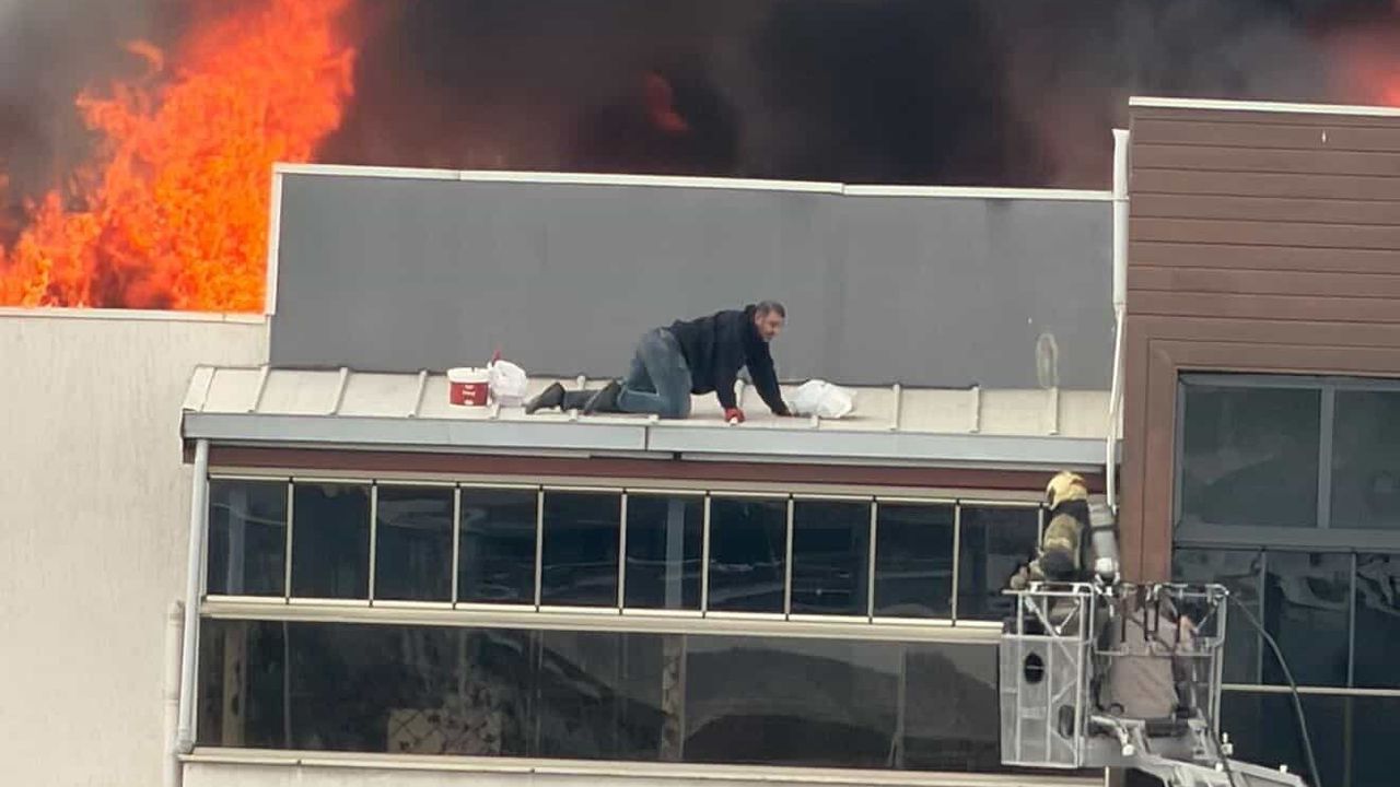 Yangında mahsur kalan bir çatı ustası ile dumandan etkilenen başka bir çalışan için zamanla yarış başladı. Kendini dışarıya atan kişi çatının ucunda kurtarılmayı bekledi. Bursa Büyükşehir Belediyesi'nin 40 metre merdivenli aracı mahsur kalan kişiyi kurtardı. Dumandan da etkilenen başka bir kişiye de 112 ekibi müdahale etti.
