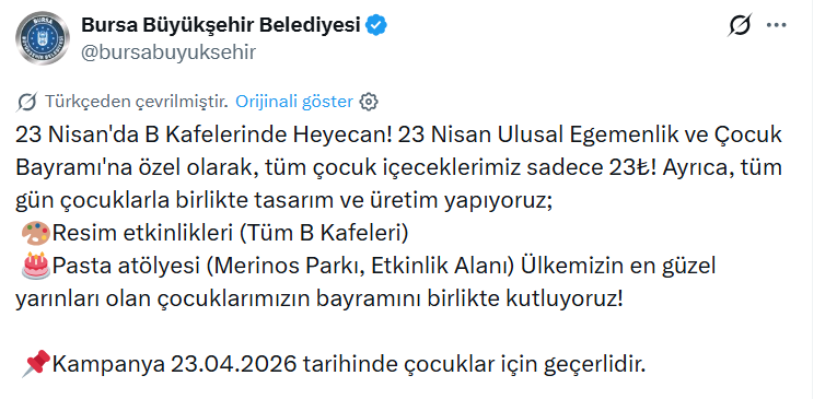 Yetkililer, kampanyanın yalnızca 23 Nisan 2026 Perşembe günü çocuklar için geçerli olacağını duyurdu. Bursa’daki ailelerin gün boyu hem etkinliklerden hem de avantajlı fiyatlardan yararlanabileceği belirtildi.