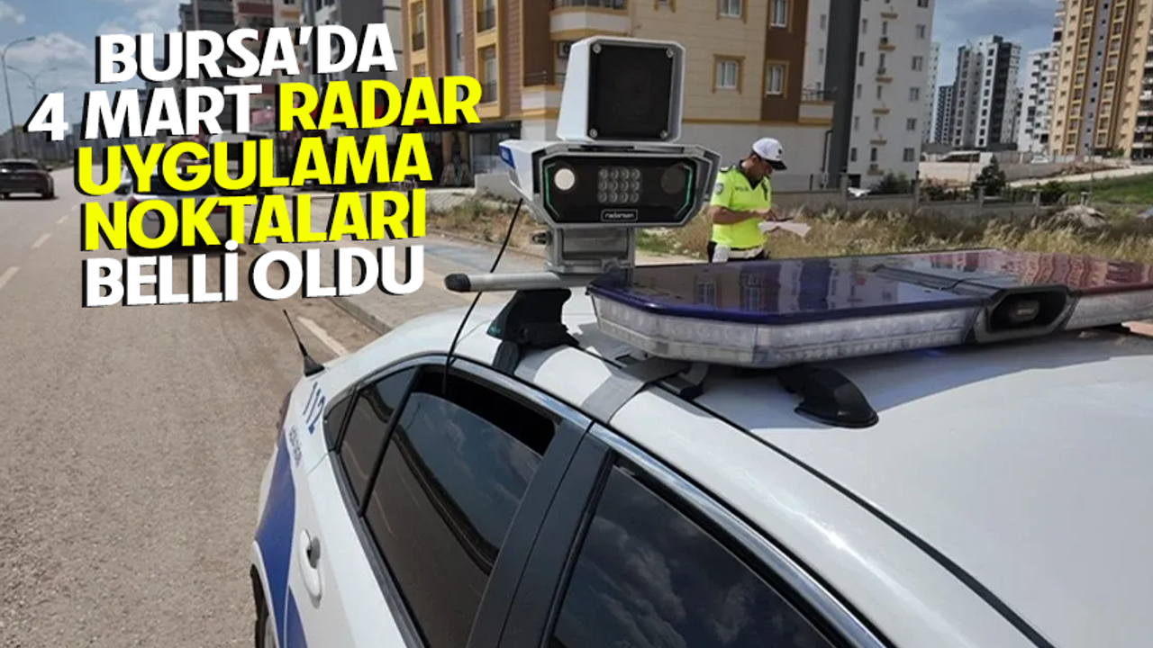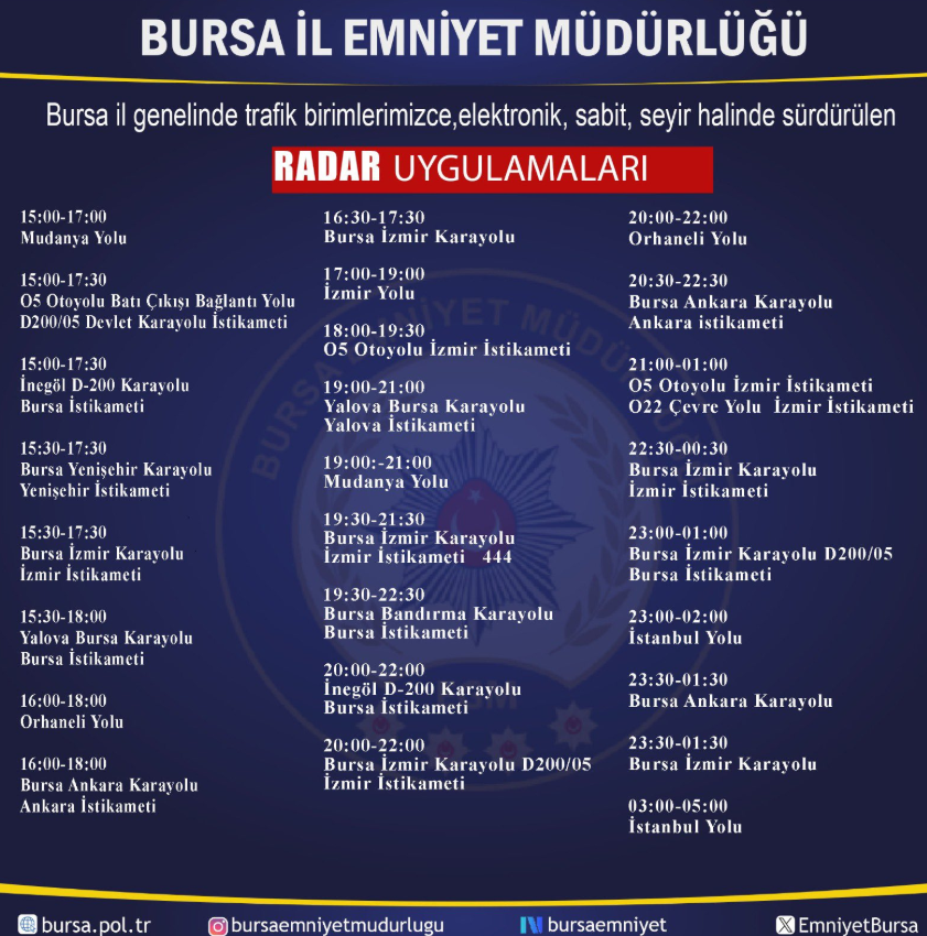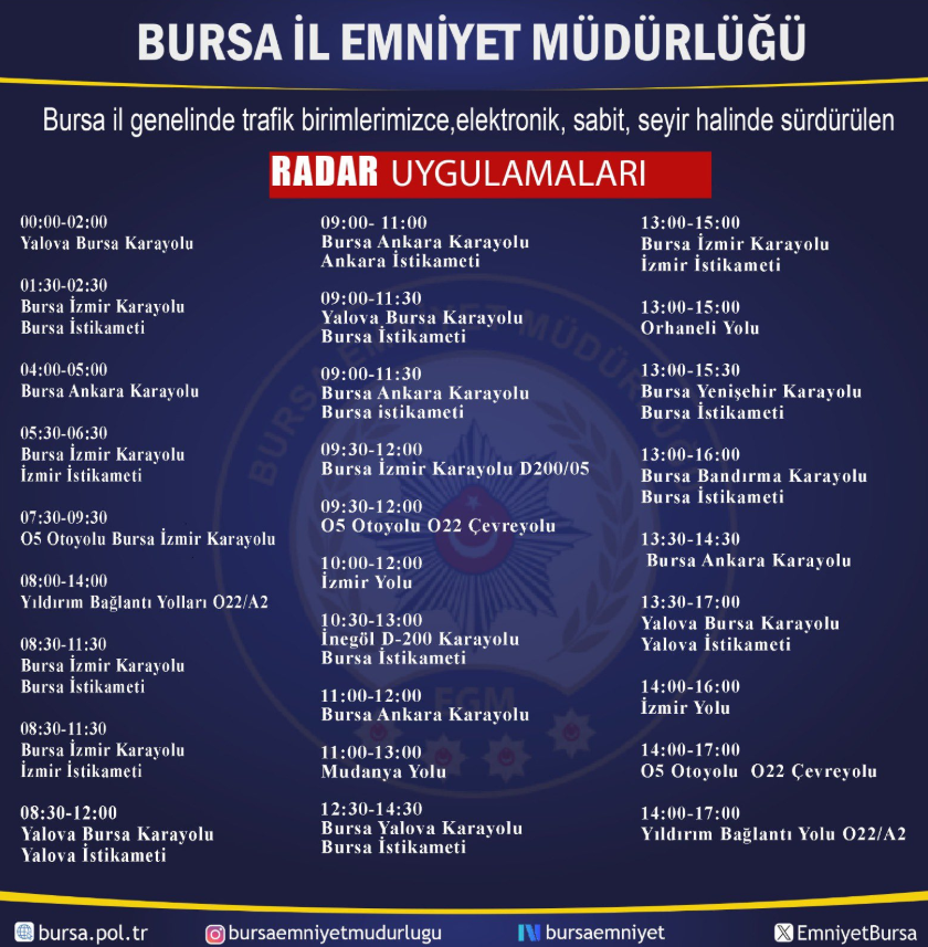 Kurallara uyulmasını sağlamak için gün boyunca farklı saat dilimlerinde Bursa genelindeki ana yollar ve bağlantı yollarında radar kontrolleri yapılacağı duyuruldu. Bursa Emniyet Müdürlüğü tarafından paylaşılan liste şu şekilde: