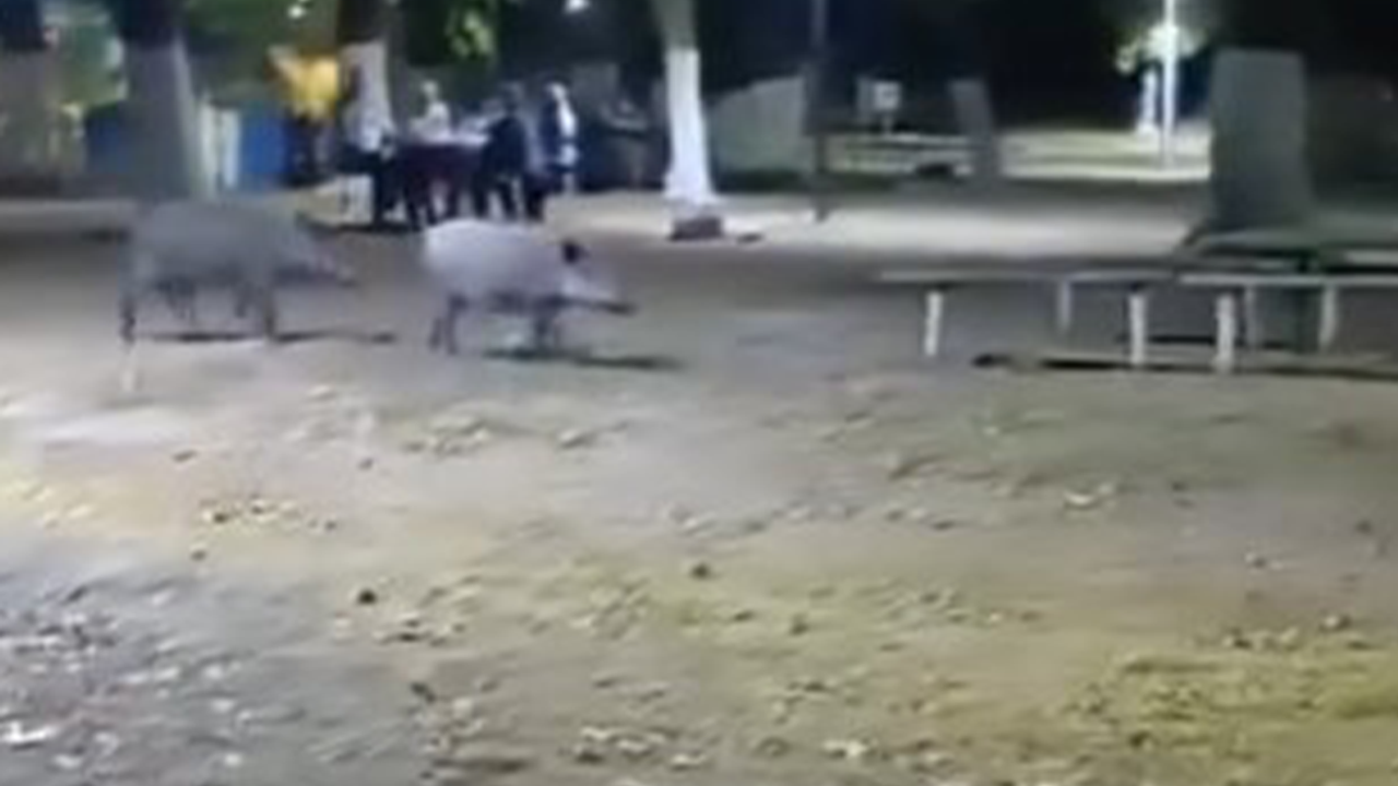 Bursa'nın Karacabey ilçesinde evlerin bulunduğu bölgeye inen yaban domuzları, parkta yiyecek aradı. Sıcak havadan bunalan vatandaşların da akşamları oturduğu piknik alanında cep telefonu kameralarına yansıyan görüntülerde, çocukların heyecanı ise dikkat çekti.