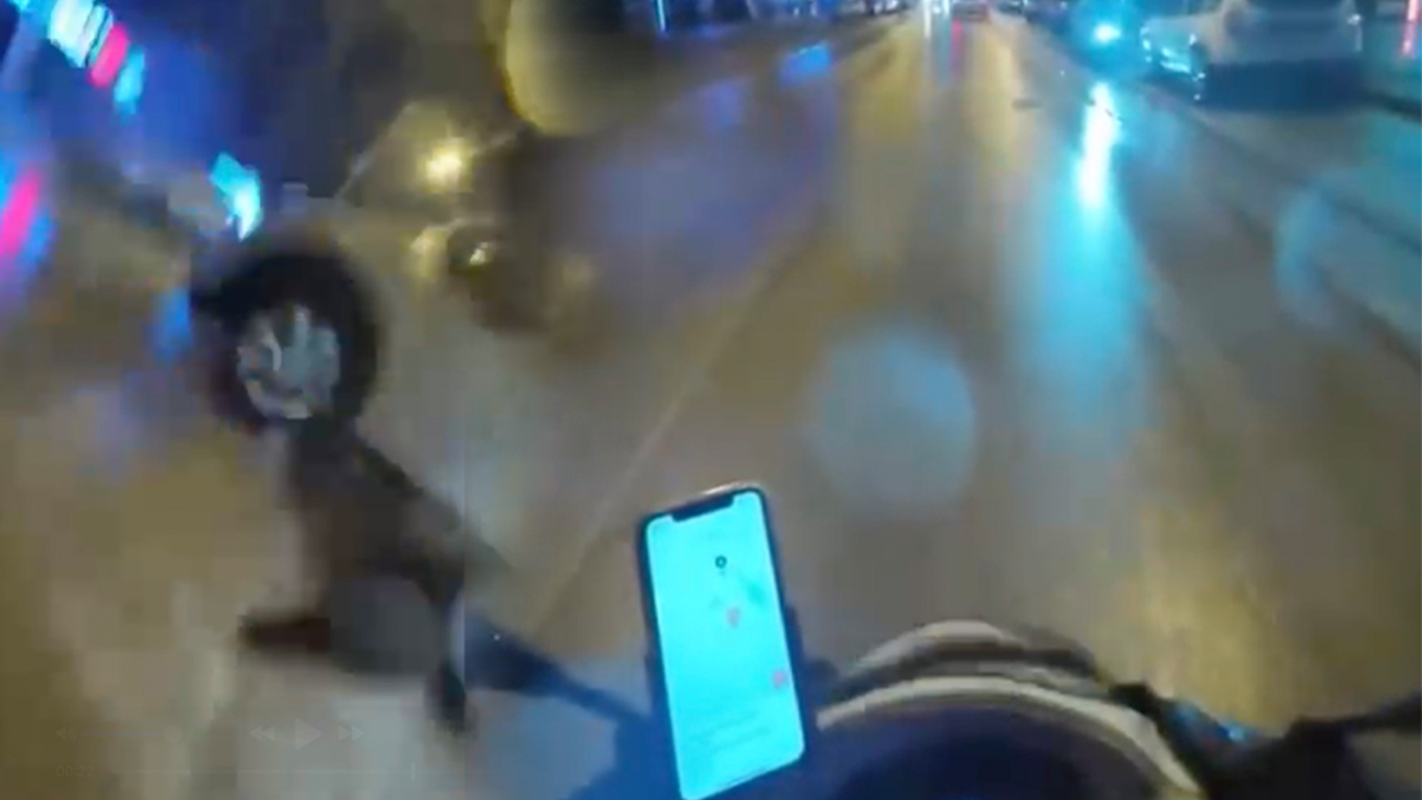 Kask kamerası görüntülerinde, cipin aniden yola çıkması, yağışın etkisiyle motosiklet sürücüsünün kontrolü kaybettiği ve panik anları yer alıyor.