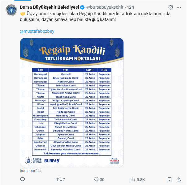 Bursa Büyükşehir Belediyesi paylaşımında, "Üç ayların ilk müjdesi olan Regaip Kandilimizde tatlı ikram noktalarımızda buluşalım, dayanışmaya hep birlikte güç katalım!" ifadelerine yer verdi.