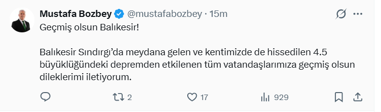 Deprem ile ilgili sosyal medya hesabı üzerinden açıklama yapan Bursa Büyükşehir Belediye Başkanı Mustafa Bozbey şu sözler kullandı: