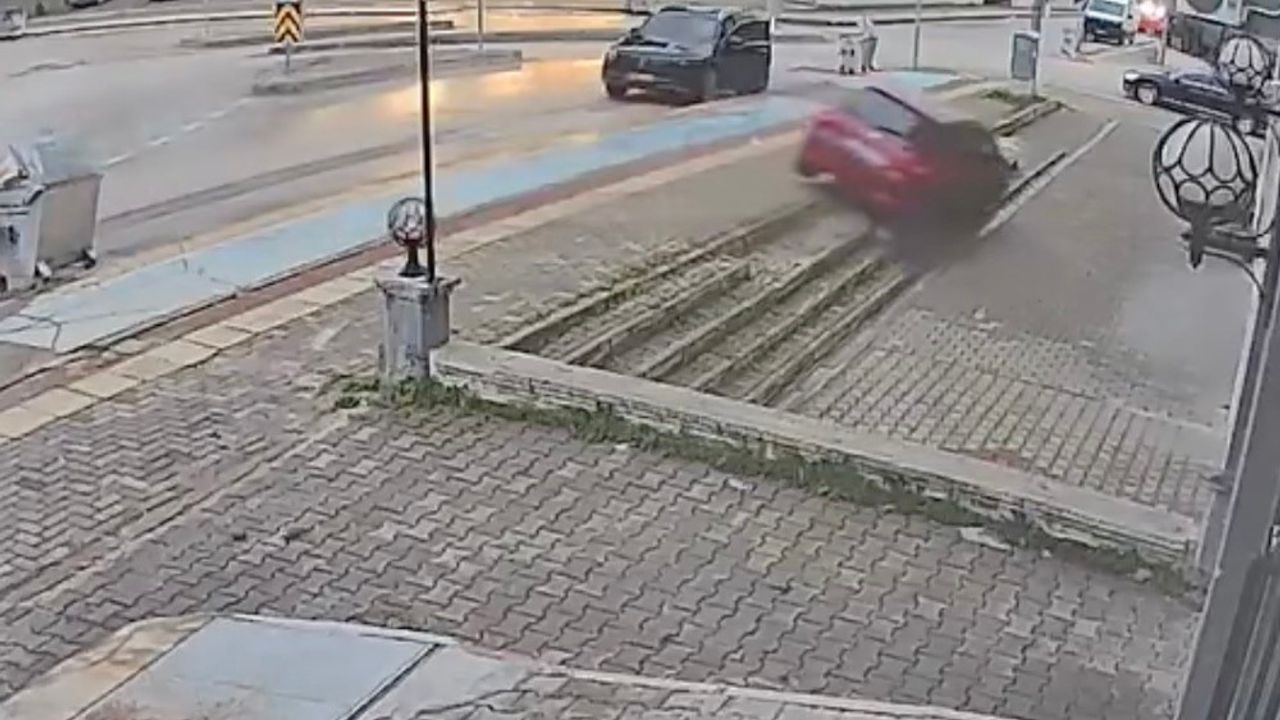 Kaldırıma çıkan araç bir iş yerinin önündeki boş alana düşerken, yaşanan panik anları güvenlik kamerasına yansıdı.