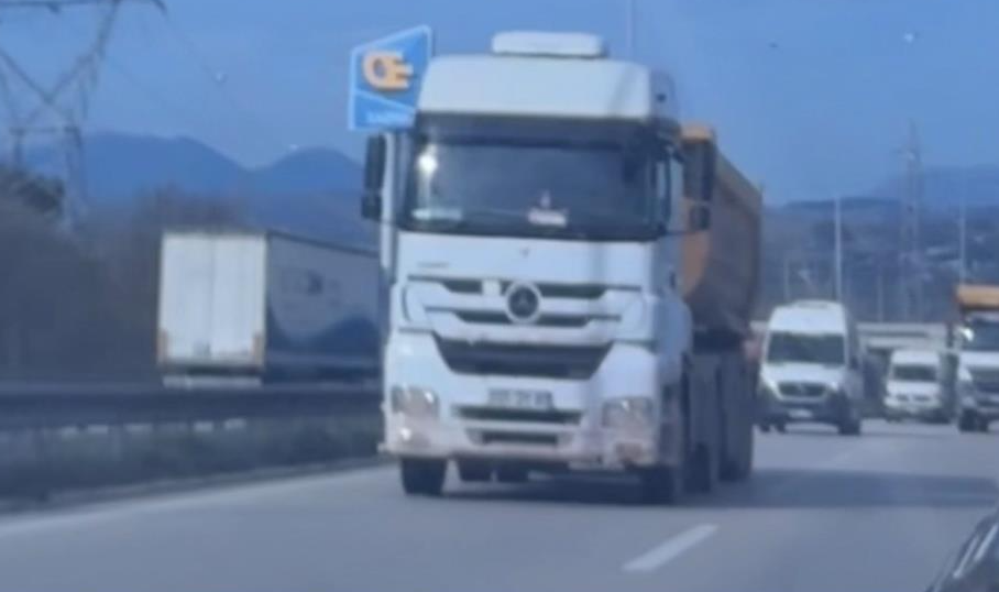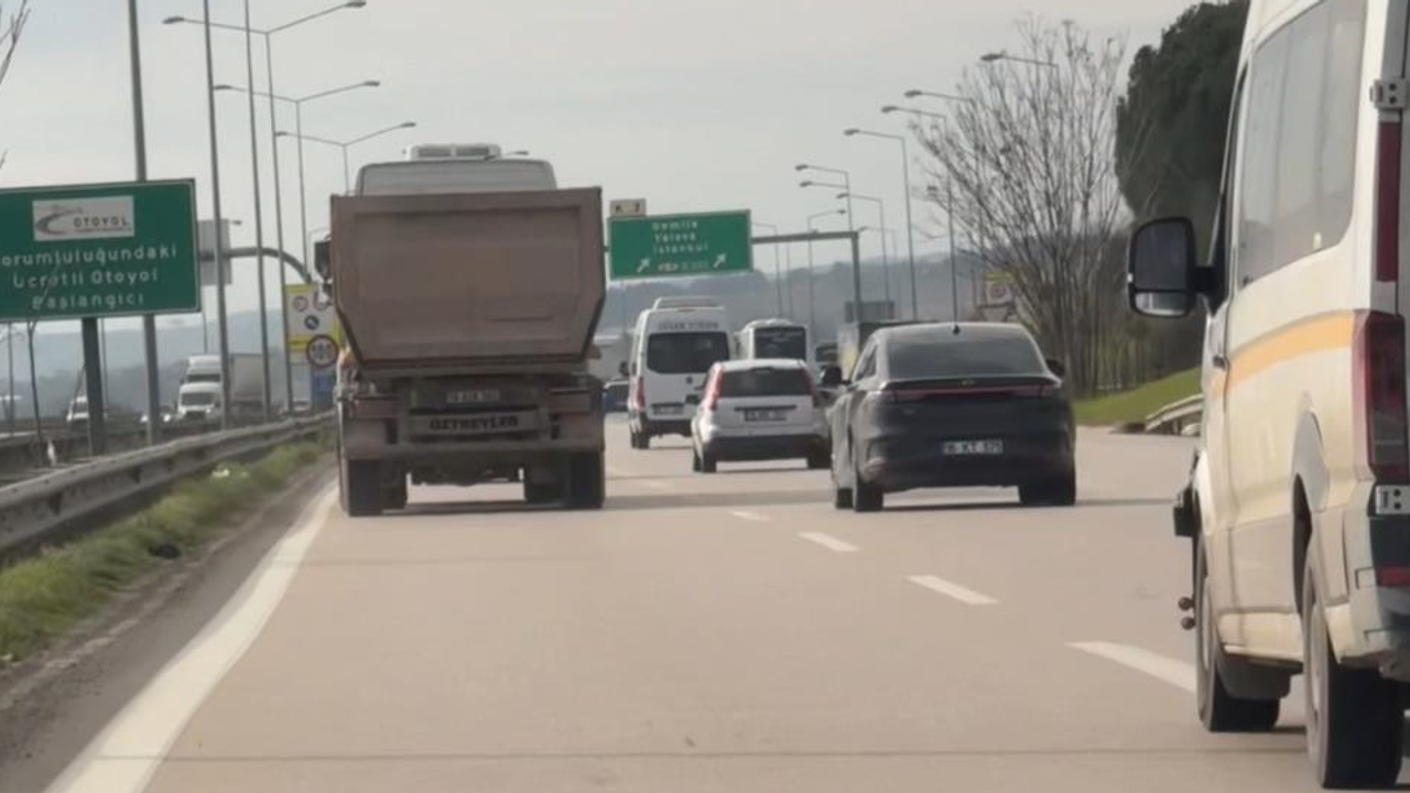 Bursa Çevre Yolu'nda seyir halinde olan bir hafriyat kamyonu, uzun araçların geçişine yasak olan en sol şeride girerek bir süre ilerledi. Kamyon sürücüsü trafik güvenliğini tehlikeye düşürerek, süratli şekilde yoluna devam etti.