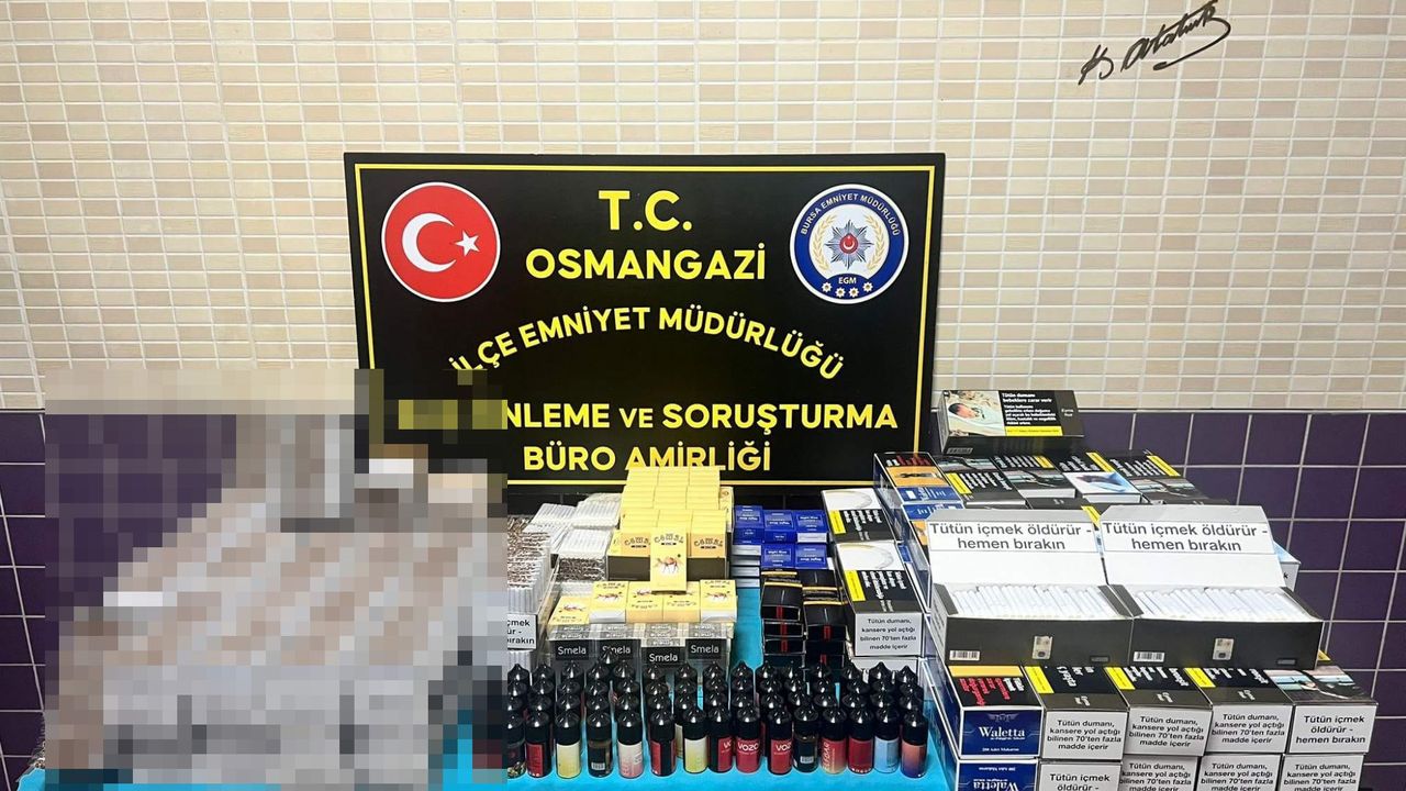 Bursa Emniyet Müdürlüğü ekipleri tarafından iki ayrı iş yerine yapılan baskında, sigara sarım makineleri, dolu makaronlar, kaçak sigaralar ve tütün ürünleri bulundu. Operasyonda toplam 4 adet sigara sarım ve dolum makinası, 22 bin 300 adet tütün doldurulmuş makaron sigara, bin 200 paket kaçak sigara, 18 kilogram kıyılmış tütün, 60 adet elektronik sigara likiti ve 7 paket kaçak nargile tütünü ele geçirildi.