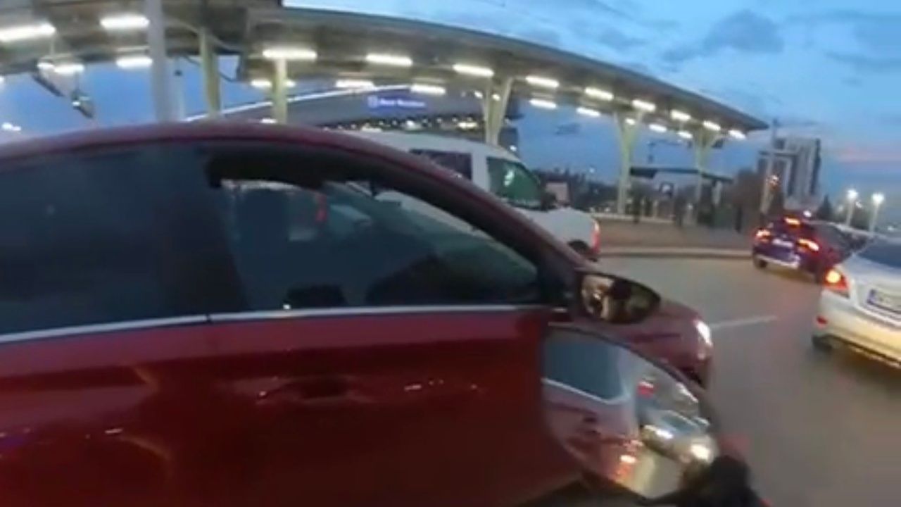 Yaşanan arbede sırasında otomobil sürücüsü motosikletliye çarparken, motosiklet sürücüsü ise öfkesine hakim olamayarak aracın aynasına vurdu. Olay anı kask kamerasına anbean yansıdı.