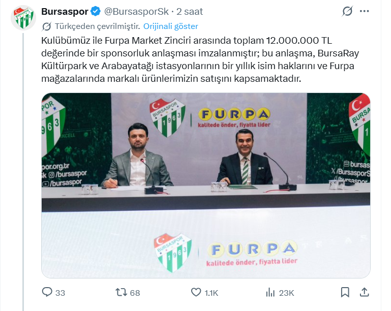 Kulübümüz ile Furpa Market Zinciri arasında toplam 12.000.000 TL değerinde bir sponsorluk anlaşması imzalanmıştır; bu anlaşma, BursaRay Kültürpark ve Arabayatağı istasyonlarının bir yıllık isim haklarını ve Furpa mağazalarında markalı ürünlerimizin satışını kapsamaktadır.