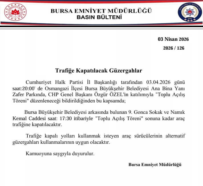 Etkinlik kapsamında, Bursa Büyükşehir Belediyesi arkasında yer alan 9. Gonca Sokak ile Namık Kemal Caddesi, saat 17.30’dan programın sona ermesine kadar araç trafiğine kapatılacak.