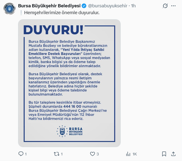 Bursa Büyükşehir Belediye Başkanımız Mustafa Bozbey ve belediye bürokratlarımızın adları kullanılarak, "Yeni Yılda İhtiyaç Sahibi Emeklilere Destek Başvuruları" üzerinden; telefon, SMS, WhatsApp veya sosyal medyadan kimlik, banka bilgisi ya da ödeme talep edildiğine yönelik bildirimler alınmaktadır. Bursa Büyükşehir Belediyesi olarak, destek başvurularının yalnızca resmi iletişim kanallarımız üzerinden yapıldığını önemle hatırlatırız. Belediye adına hiçbir şekilde kişisel bilgi veya ödeme talebinde bulunulmamaktadır. Bu tür taleplere kesinlikle itibar etmeyiniz. Şüpheli durumlarda 444 16 00 numaralı Bursa Büyükşehir Belediyesi Çağrı Merkezi'ne veya Emniyet Müdürlüğü'nün 112 İhbar Hattı'na bildirmenizi rica ederiz."