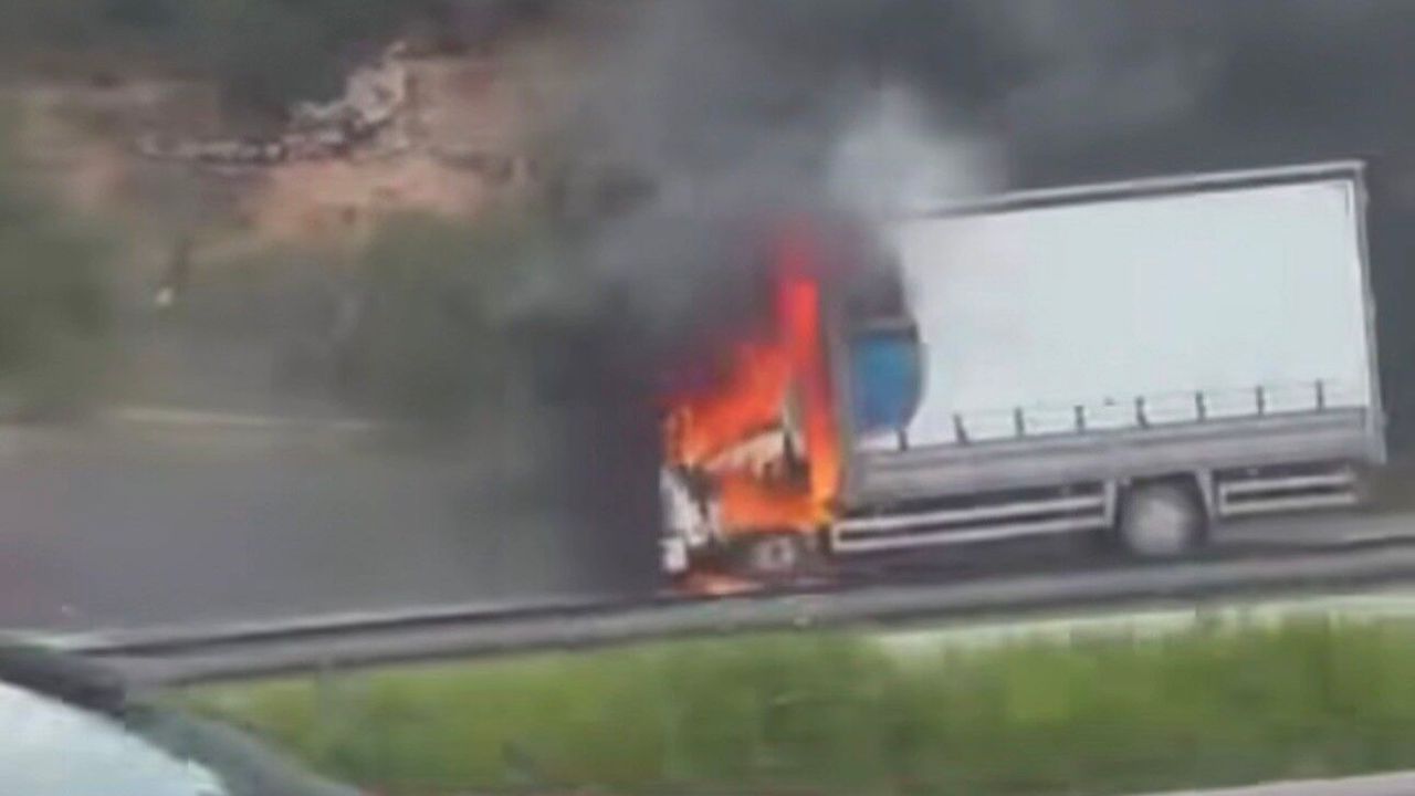 Edinilen bilgiye göre, seyir halindeki bir kamyon henüz belirlenemeyen bir nedenle alev aldı. Kısa sürede büyüyen yangın kamyonu tamamen sararken, sürücü aracı yol kenarına çekerek kendini dışarı attı.