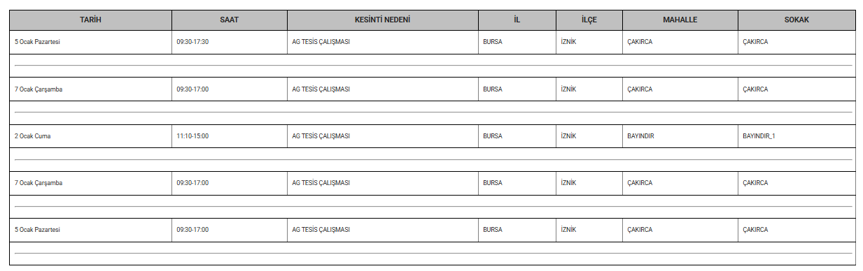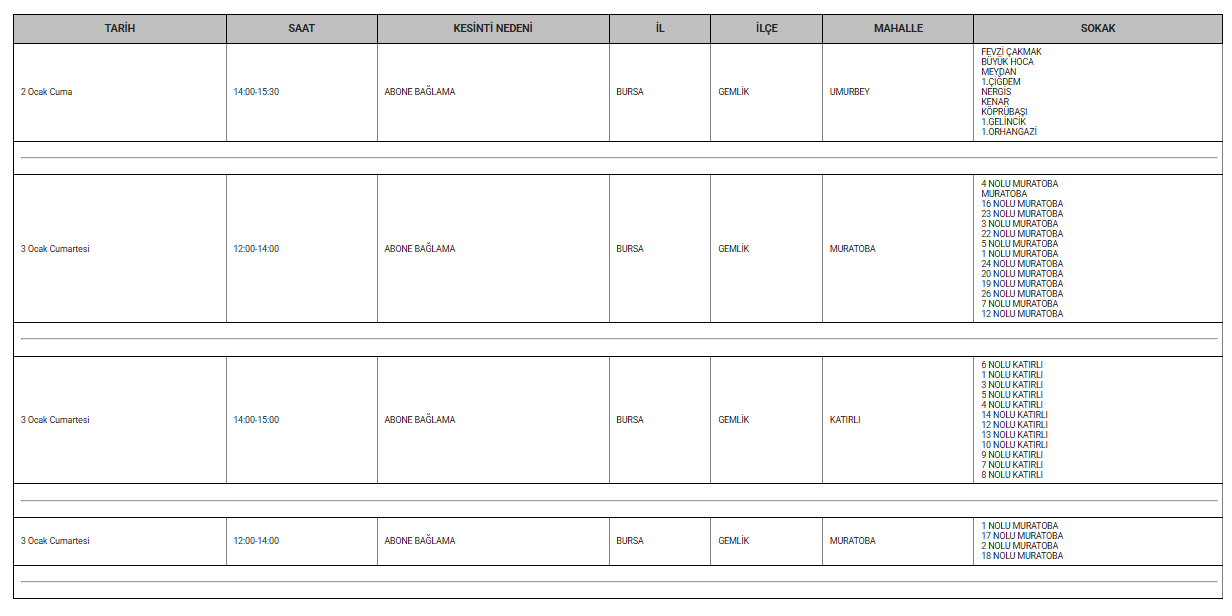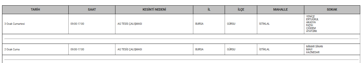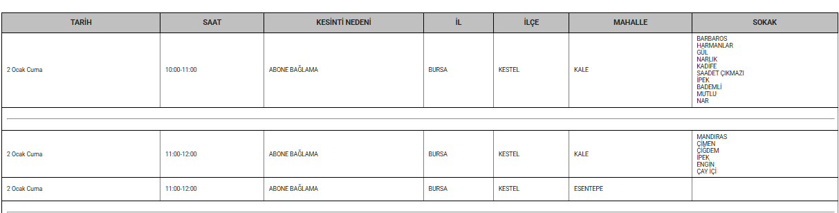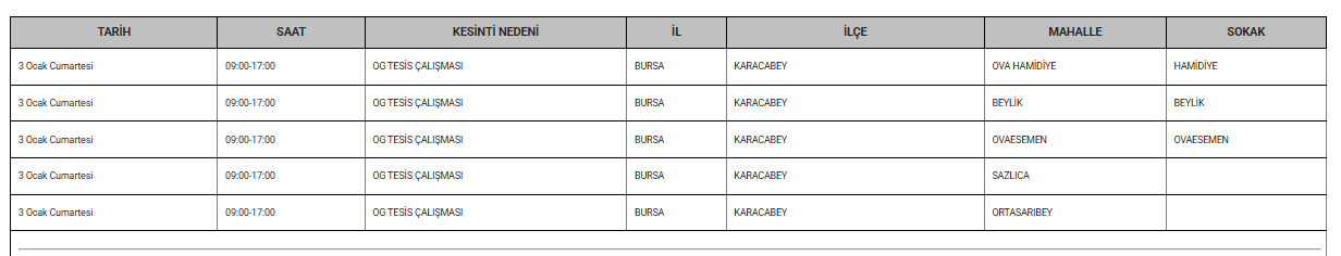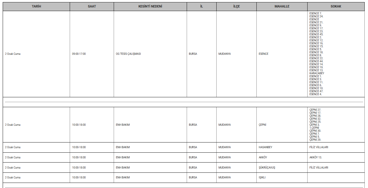 Yapılan açıklamada, 1–7 Ocak tarihleri arasında gerçekleştirilecek abone bağlama, OG tesis ve fiziki irtibat ile trafo bakım çalışmaları nedeniyle İnegöl, Gemlik, Gürsu, İznik, Karacabey, Kestel, Mudanya ve Nilüfer ilçelerinde belirli saatlerde elektrik kesintisi yaşanacağı bildirildi.