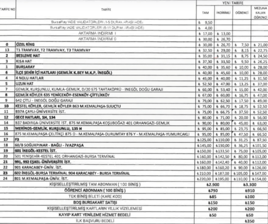 Gece hatlarında (1H, 1J, 134) tam bilet 80 lira olarak belirlenirken, İnegöl- Terminal ve Karacabey- Terminal hatlarında ücretler 210 lira bandına yükseldi. Mustafakemalpaşa-Üniversite hattı ise 220 liraya yükseldi.