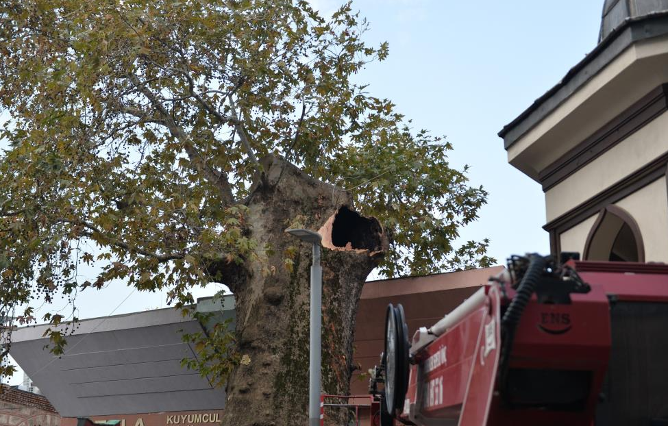 Bursa’nın simge yapılarının başında gelen Ulu Cami’nin avlusunda bulunan 346 yaşındaki asırlık çınar ağacının büyük dalı, henüz bilinmeyen bir nedenle koptu. Ağacın gövdesiyle şadırvan arasında sıkışan dal, belediye ekiplerinin çalışmasıyla bulunduğu yerden kaldırıldı. Büyükşehir Belediyesi, Bursa için kadim medeniyetin sembolü olan asırlık çınarı tekrar geleceğe taşımak için zaman kaybetmeden harekete geçti.