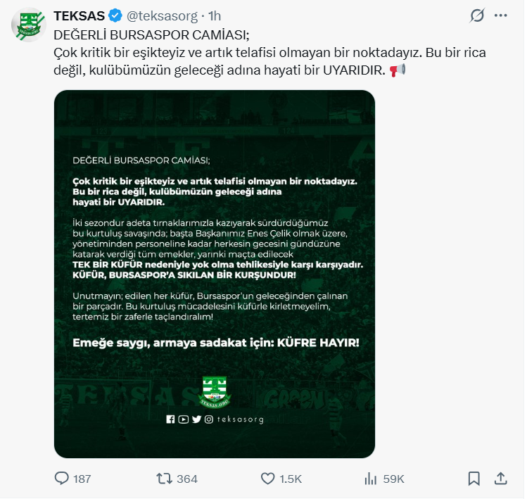 Bursaspor taraftar grubu Teksas, taraftarları önemli bir konuda uyardı. Açıklamada, kulübün son iki sezondur büyük emek ve fedakârlıklarla yürüttüğü kurtuluş mücadelesinin, tribünlerde atılacak tek bir küfür nedeniyle ciddi risk altında olabileceği vurgulandı.