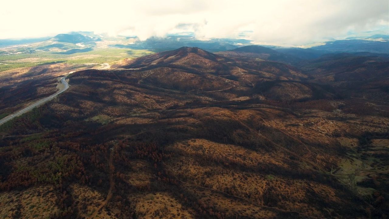 Yangın sonrası bölgenin havadan görüntülendiği çalışmalarda, yanmış ağaçların kontrollü şekilde kesildiği ve sahadan kaldırıldığı kameralara yansıdı.