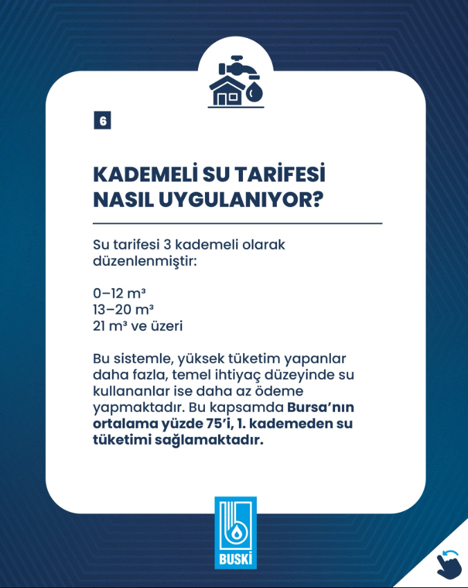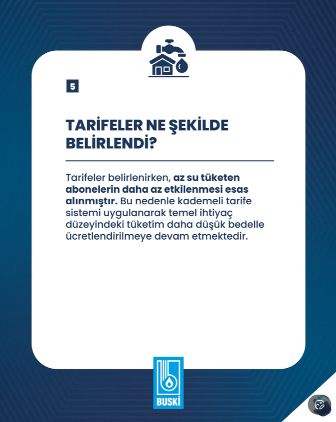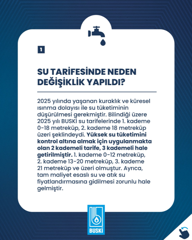 BUSKİ, 2025 yılında yaşanan kuraklık ve küresel ısınmanın etkisiyle su tüketiminin azaltılması ve kaynakların korunması amacıyla tarifede düzenlemeye gidildiğini açıkladı. Bu kapsamda daha önce iki kademeli olan su tarifesi üç kademeli hale getirildi.