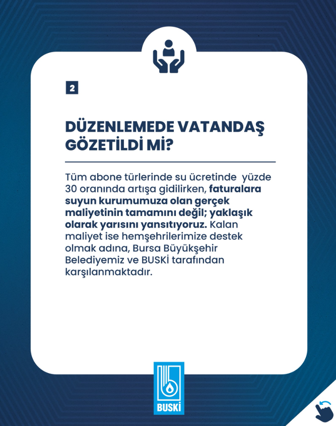 Kurum, tüm abonelerde yüzde 30 oranında artış yapılmasına rağmen, suyun gerçek maliyetinin tamamının faturalara yansıtılmadığını, yaklaşık yarısının Bursa Büyükşehir Belediyesi ve BUSKİ tarafından karşılandığını bildirdi.