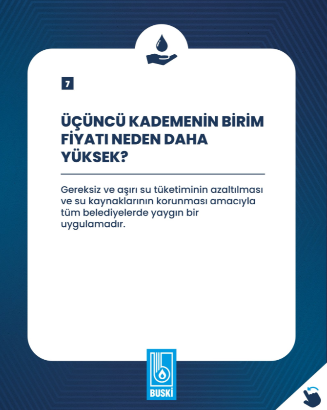Kurum, gereksiz ve aşırı su tüketiminin azaltılması ve su kaynaklarının korunması amacıyla üçüncü kademede birim fiyatın daha yüksek uygulandığını kaydetti.
