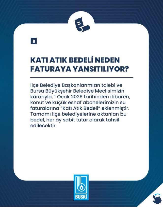 İlçe belediyelerinin talebi ve Bursa Büyükşehir Belediye Meclisi’nin kararı doğrultusunda, 1 Ocak 2026’dan itibaren konut ve küçük esnaf abonelerinin su faturalarına katı atık bedeli eklendiği bildirildi. Bu bedelin tamamının ilçe belediyelerine aktarıldığı ifade edildi.