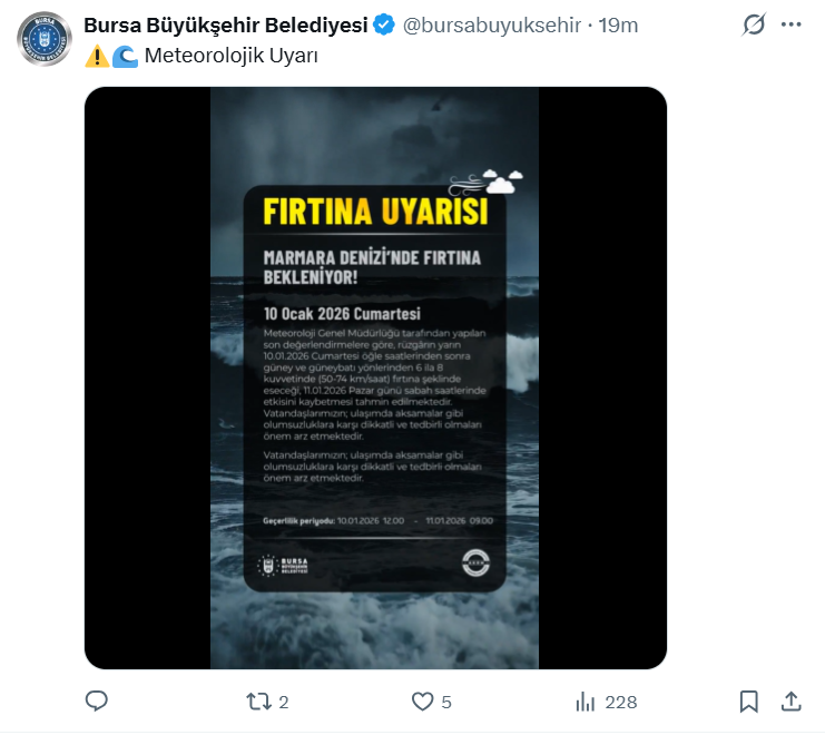Meteoroloji Genel Müdürlüğü tarafından yapılan son değerlendirmelere göre, rüzgârın bugün 10.01.2026 Cumartesi öğle saatlerinden sonra güney ve güneybatı yönlerinden 6 ila 8 kuvvetinde (50-74 km/saat) fırtına şeklinde eseceği, 11.01.2026 Pazar günü sabah saatlerinde etkisini kaybetmesi tahmin edilmektedir. Vatandaşlarımızın; ulaşımda aksamalar gibi olumsuzluklara karşı dikkatli ve tedbirli olmaları önem arz etmektedir.