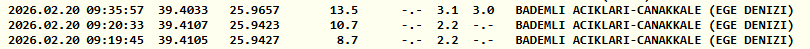 Açıklanan verilere göre ilk deprem 09.19'da 2.2 büyüklüğünde gerçekleşti. İkinci deprem 09.20'de kaydedildi. Kandilli bu depremin büyüklüğünü 2.2 olarak açıkladı. Son deprem ise 09.35'te 3.1 büyüklüğünde meydana geldi. Kandilli bu depremlerin derinliğini sırasıyla 8.7 kilometre, 10.7 kilometre, 13.5 kilometre olarak açıkladı.