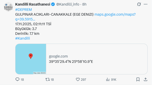Kandilli Rasathanesi, yaptığı paylaşımda Gülpınar açıkları – Çanakkale (Ege Denizi) merkezli bir deprem meydana geldiğini duyurdu. Depremin saat 02.11’de kaydedildiği, 3.7 büyüklüğünde olduğu ve 7.7 km derinlikte gerçekleştiği bildirildi.